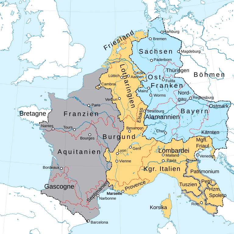 Überregional: Vertrag von Meerssen am 8. August - An Ludwig den Deutschen fällt der nordöstliche Teil des ehemaligen Lotharingiens mit den Städten Köln, Utrecht, Aachen, Trier, Metz, Prüm, Straßburg und Basel sowie das Elsass und "zwei Drittel von Friesland". Karte ansehen (externes PDF)